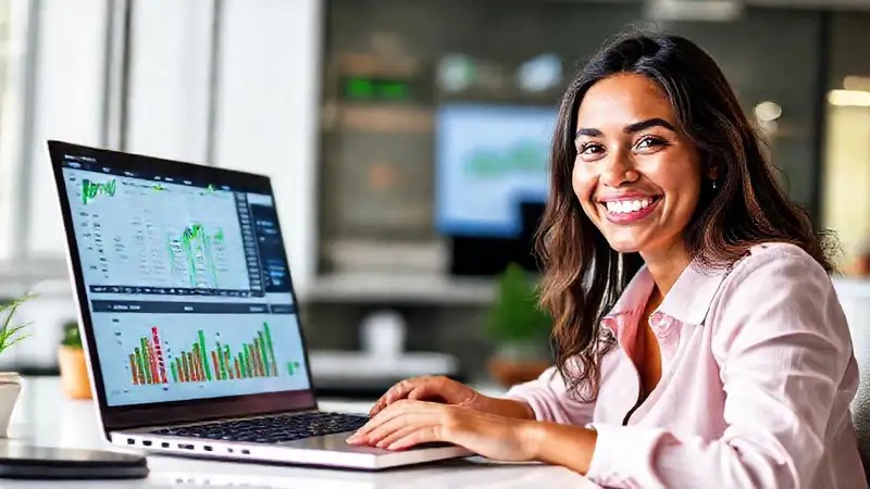 Una mujer sonríe en finanzas digitales