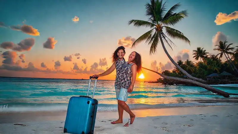 Una pareja feliz planea un viaje tropical